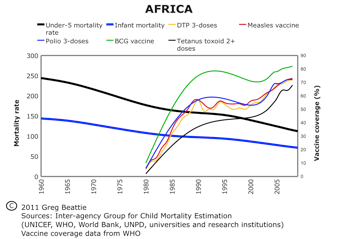 [12] If you perform a ‘google’ search for ‘infant mortality rate’ or ‘under-5 mortality rate’ you will locate a google service that provides most of this data. It is downloadable in spreadsheet form by clicking on the ‘More info’ link. http://data.worldbank.org/indicator/SH.DYN.MORT/countries/1W-US?display=graph :Vaccine coverage data is available from the WHO website http://www.childinfo.org/files/Immunization_Summary_2008_r6.pdf