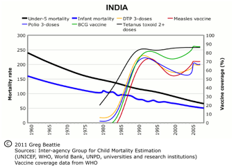 This graph may appear complex, but it is not difficult to read. The two thick lines running horizontally through the graph are the infant (the lower blue line) and under-5 (the upper black line) mortality rates per 1000 from 1960 to 2009. The handful of finer lines which commence in 1980, at a low point, and shoot upward over the following decade, represent the introduction of the various vaccines. The vertical scale on the right side of the graph shows the rate at which children were vaccinated with each of these shots. The primary purpose of this graph (as well as that in Figure 2) is to deliver the real good-news. We see a slowly, but steadily improving situation. Death rates for infants and young children are declining. I decided to add the extra lines (for vaccines) to illustrate that they appear to have had no impact on the declining childhood mortality rates; at least, not a positive impact. If they were as useful as we have been led to believe, these vaccines (covering seven illnesses) would surely have resulted in a sharp downward deviation from the established trend. As we can see, this did not occur. In Africa, the vaccines were introduced at the start of the 1980s and, within a decade, reached more than half the children. The only effect observable in the mortality rates, is a slowing of the downward trend. In other words, if anything were to be drawn from this, it would be that the introduction of the vaccines was counter-productive. One could argue that the later increase in vaccine coverage (after the year 2000) was followed by a return to the same decline observed prior to the vaccines. However, that does not line up. The return to the prior decline predates it, by around five years. With both interpretations we are splitting hairs. Since we are discussing an intervention that has been marketed as a modern miracle, we should see a marked effect on the trend. We don’t. The WHO region of Africa (also referred to as sub-Saharan Africa) is where a substantial portion of the world’s poor-health burden is thought to exist. The country that is believed to share the majority of worldwide child mortality burden with sub-Saharan Africa is India, in the WHO south-east Asia region. Together, the African and South-east Asian regions were thought in 1999 to bear 85% of the world’s measles deaths[14]. Figure 2 shows India’s declining infant and under-5 mortality rates, over the past 50 years. Again, the introduction of various vaccines is also shown.