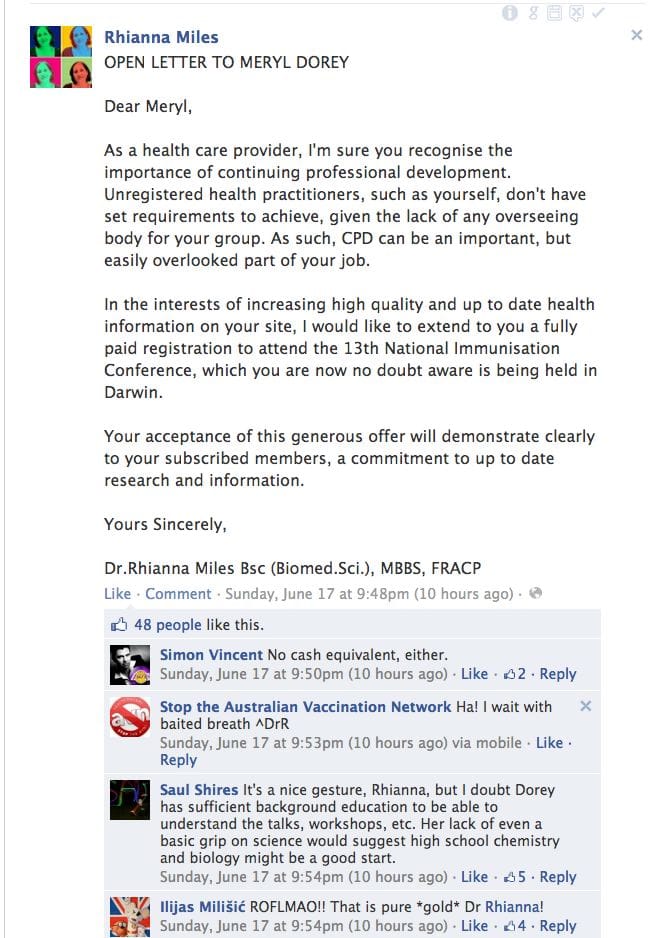 Doctor Rhianna Miles, a woman who has publicly described both myself and several other supporters of the AVN as c*nts on more than one occasion (please see one instance below), and whose online behaviour is far from what would be expected from a member of the medical profession, has kindly placed an offer of a free registration to the 13th International Immunisation Conference in Darwin to myself on the Stop the AVN Facebook page. I normally don't read that page - though I have several helpers who take daily screenshots. One of those members told me about this post.