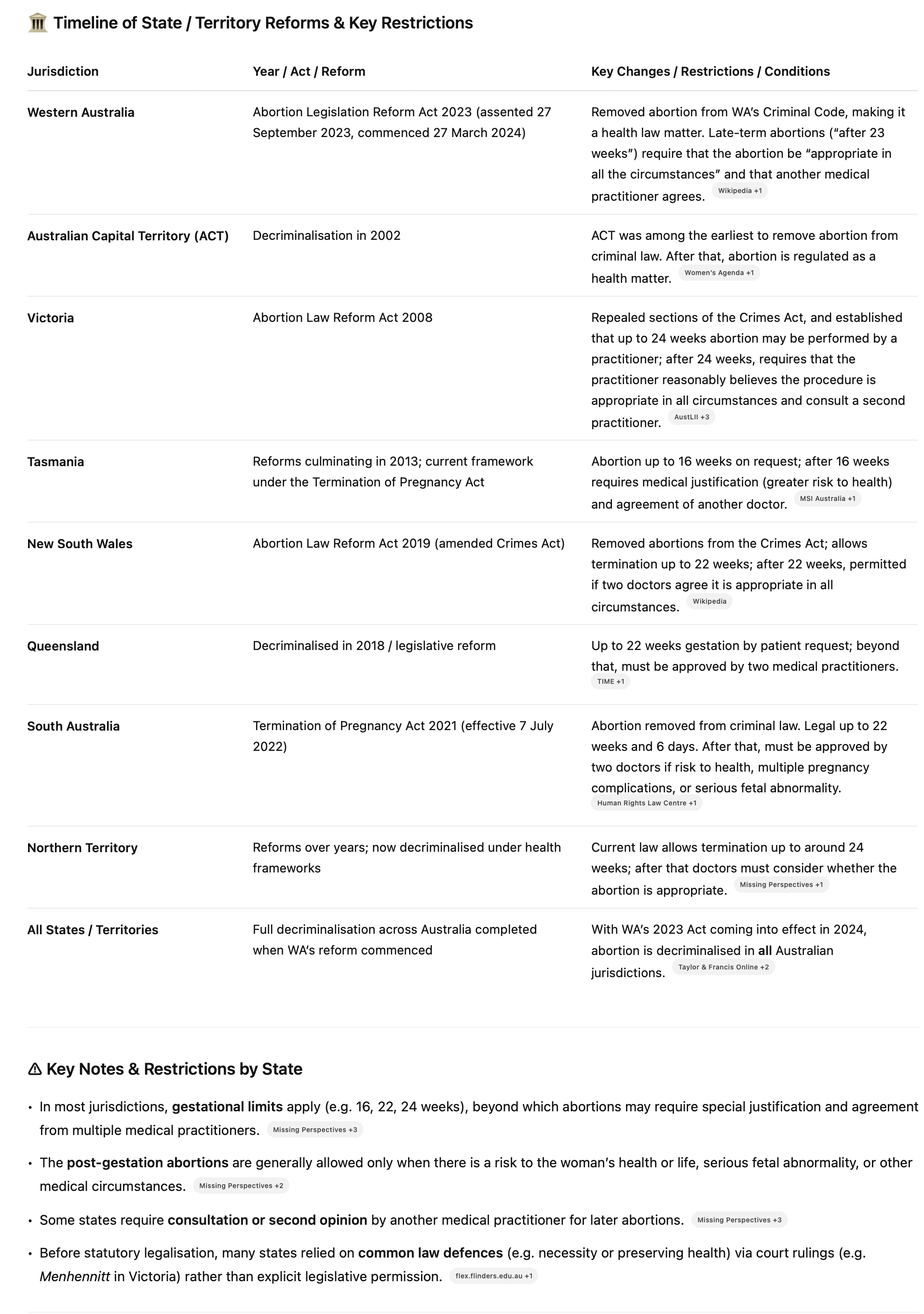 Since States nominally have the power over healthcare, state-based legislation to decriminalise abortion came in after 1998. Please see the table and explanatory notes below: