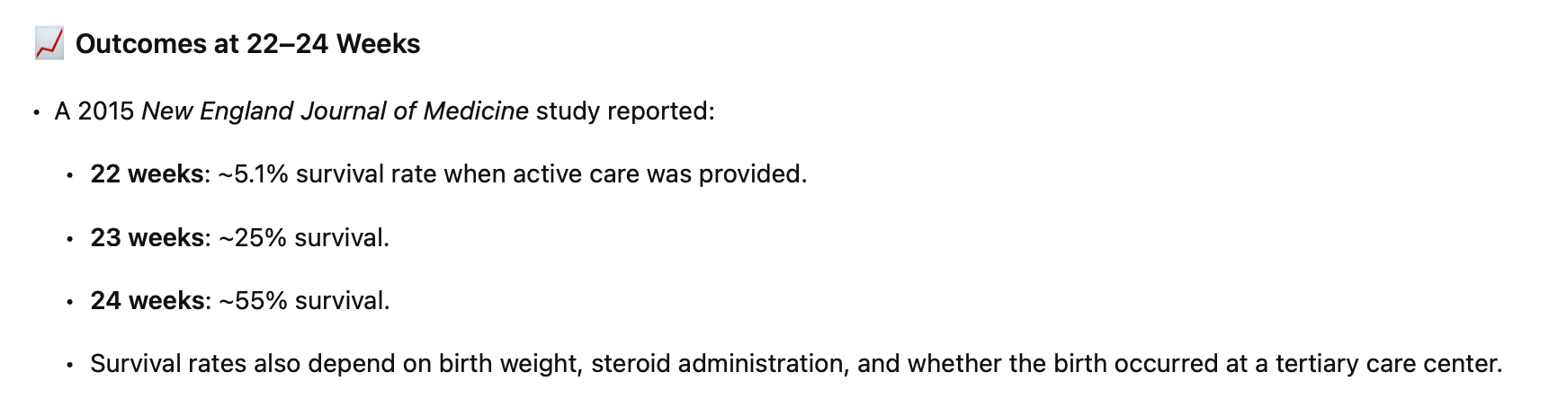 As you can see from the table above, babies up to 24 weeks’ gestation can be aborted in many states of Australia and 22 weeks in others. Except in the case of severe foetal abnormality, the table below shows what the chances are that these infants could have survived being aborted.