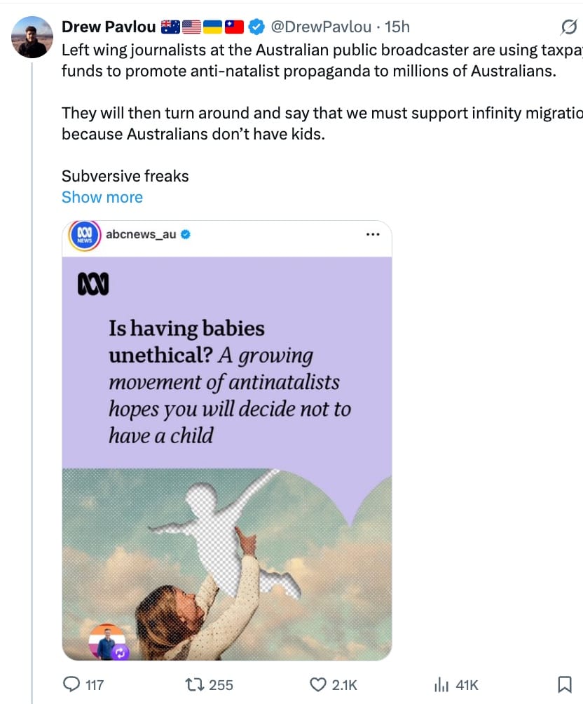 A new word has emerged into popularity for the unthinking, moronic members of the death cult who are trying to convince otherwise normal humans that there is something wrong with reproducing in order to continue the species. This article, Is having babies unethical? from somebody else’s ABC (it’s certainly not ours) is typical. It uses the word, ‘anti-natalist’ in order to lend legitimacy to those who want us to just stop having babies already!