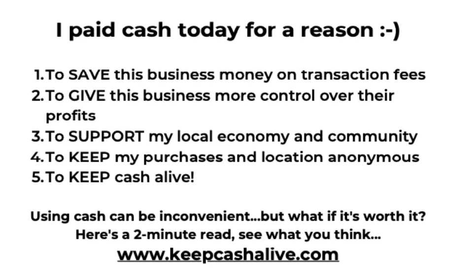 Don’t forget to print out and carry with you/share widely the Keep Cash Alive printables and to spend cash wherever and whenever possible.
