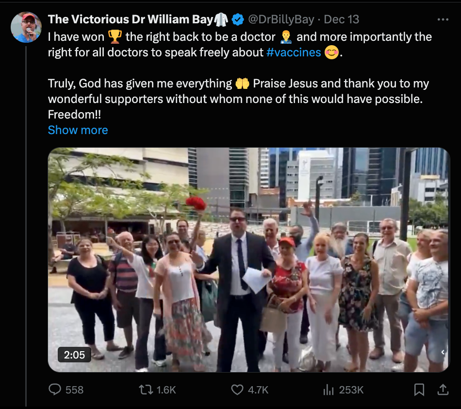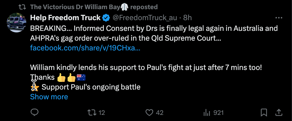 The court found that Billy Bay had been denied procedural fairness (which is the understatement of the century) and that neither AHPRA nor the Medical Board had considered any of his arguments before removing his license to practice medicine.