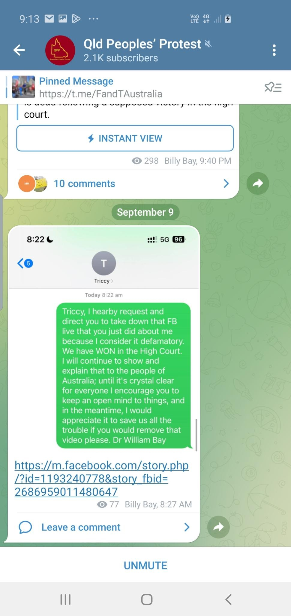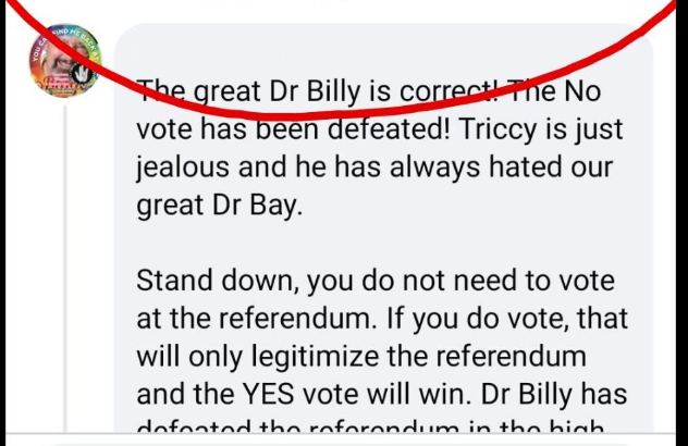 I know that publishing this post will make me a target of Billy’s vexatious suits, but I feel it is important enough to expose these actions because as you can see below, he is already convincing some people who are not taking the time or effort to research themselves, that they no longer need to vote in the referendum.