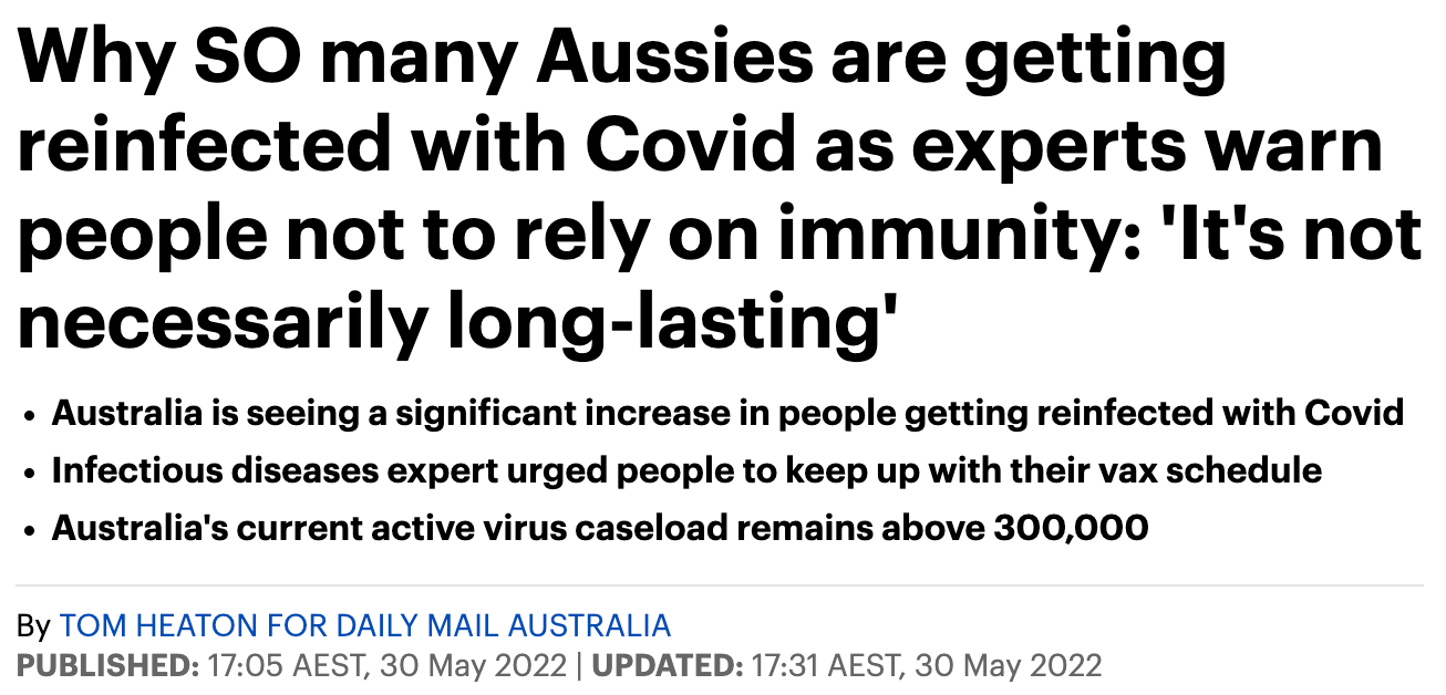 And you wouldn’t want to read about it (you really wouldn’t), but places like Victoria that have been the most tyrannical in enforcing unscientific lockdowns, masking and experimental bioweapon mandates have had the highest level of reinfection amongst the jabbed and ‘boosted’.