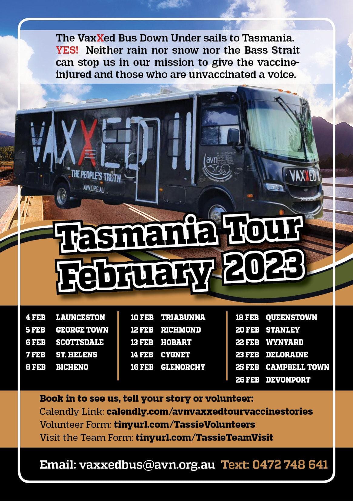 Every morning since the VaxXed Bus has been on the road heading down to Tasmania, I have livestreamed messages about where we’re heading so that people who want to cheer us on can do so on the road and also to let people know where we’ll be.