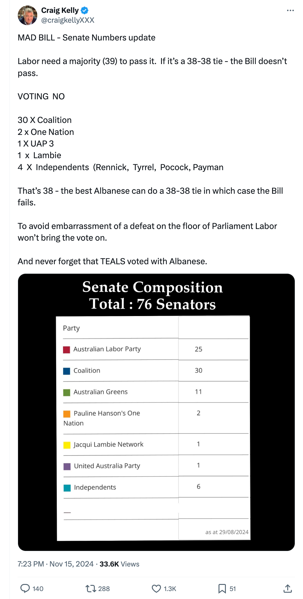 Oh, and I almost forgot to say (where is my head???) that it appears the draconian Mis and Disinformation legislation will NOT pass Parliament! Enough Senators will vote against it to see it defeated. Can this day get any better?