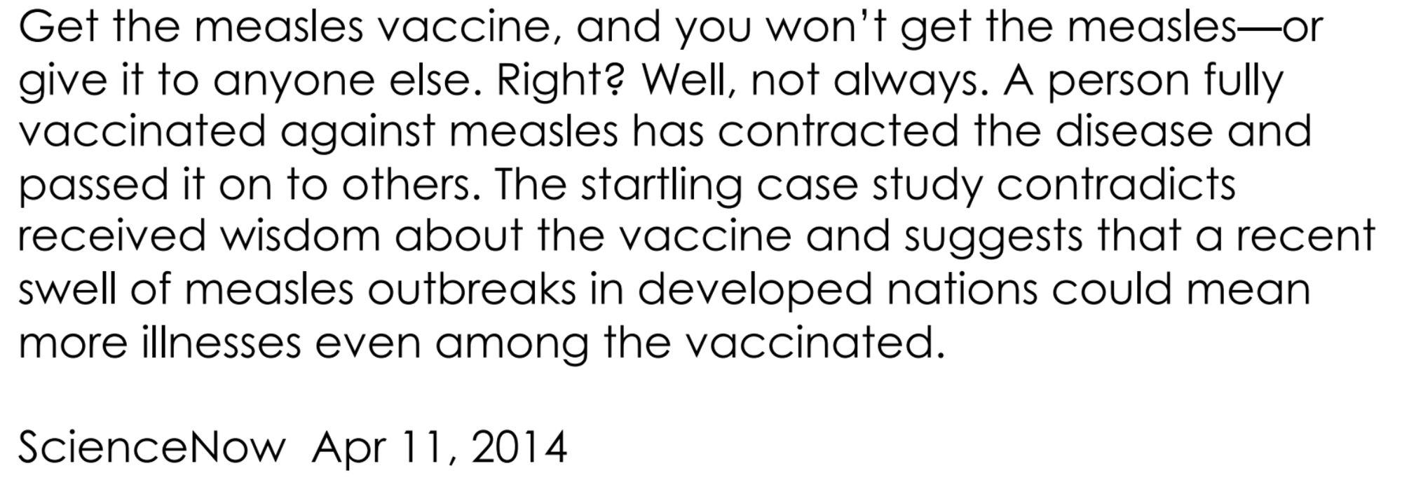 Whoever authored this Science article expressed surprise at the fact that a vaccinated person both contracted and transmitted measles. But this phenomenon has been known about since the 1960s not long after the introduction of the measles vaccine and it was opined that in the future, it would mainly be the vaccinated who got measles. A prediction that came to pass.
