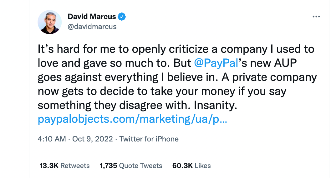 David Marcus, former CEO of Paypal, sent the tweet above criticising the company he used to run for inserting what amounts to a social credit system between Paypal’s customers and their own funds.