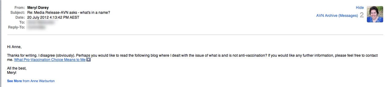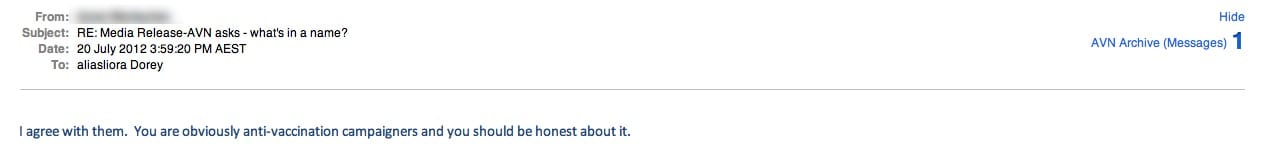 Below is an email exchange with an ABC radio journalist from Tasmania regarding this issue. She wrote in response to the press release I put out the other day on the issue of the AVN being forced to change our name. (If you click on the images below, you will be able to view each email in full size) Please keep in mind that the journalist in question has been a speaker at an Australian Skeptics national conference and therefore, would be far from unbiased when it comes to this issue. Yet she wrote to me using her ABC email address as though it were an official ABC communication. It is apparent that her opinion of the AVN has been formed by listening to what should be registered as a hate group - the Australian Skeptics - and their splinter organistion - Stop the AVN. She neither knows what the AVN does by speaking with us nor, it appears, does she care to know.
