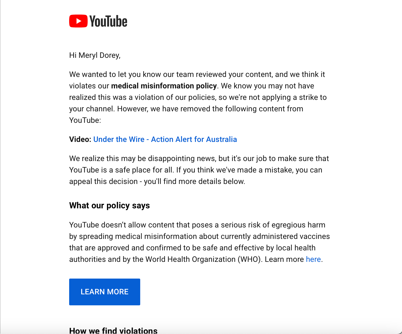 This is the email I received this afternoon from YouTube. They say that I didn’t get a strike but I’ve been unable to use that account for over 18 months now.