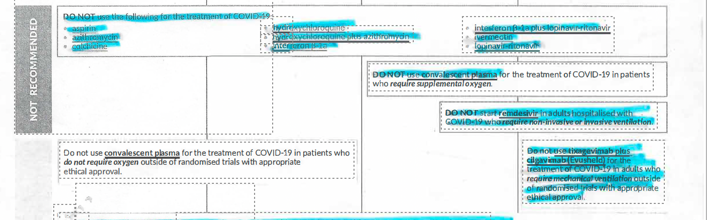 Above (you might have to click on the image and zoom in to make it big enough to read) are the list of treatments which are NOT RECOMMENDED. Among those remedies are Ivermectin and Hydroxychloroquine - both drugs which have been safely used for decades and which, 20 years ago, Saint Anthony Fauci described as being very effective at preventing and treating SARS.