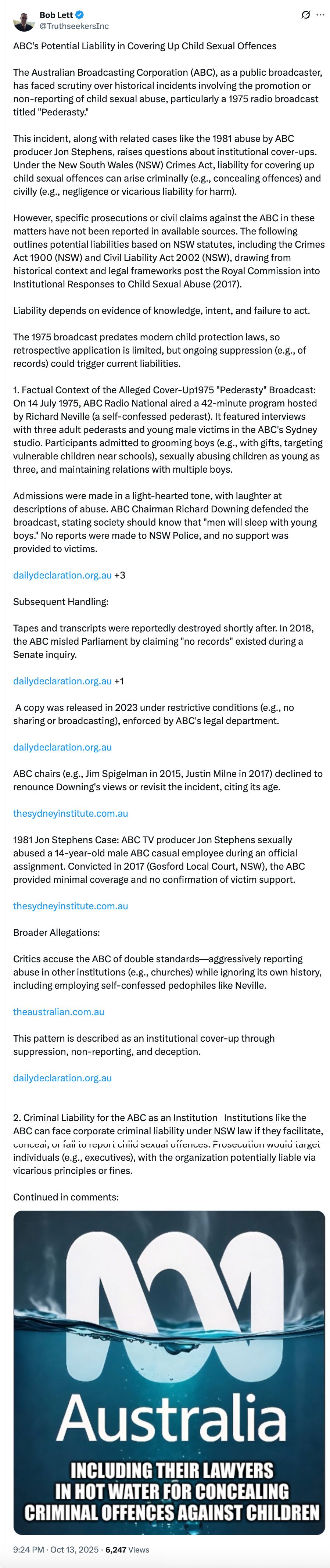There is also further information about the ABC’s liability in this case. Because after all - they covered up these pederasts who had been taking advantage of underage boys for God only knows how long! You can read the original thread at this link - the start of it is below.