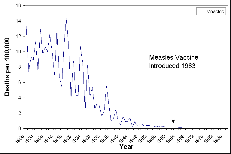 Here, you can see that when you go back to the turn of the century, that blip in measles that took place around 1950 doesn't quite look so big in the grand scheme of things, does it (both of these graphs are from the US)? In fact, you can see that just like in the UK, the death rate from measles declined by 99% BEFORE the vaccine was introduced.
