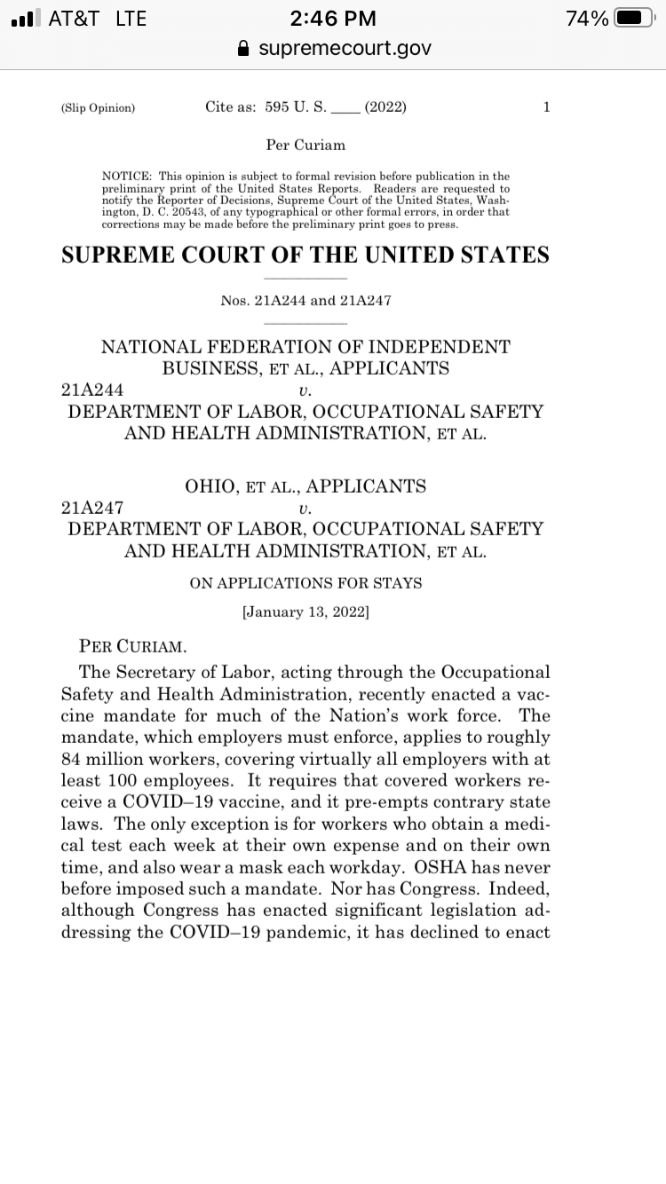 This won’t be a long post - just a happy celebration - a la Kool and the Gang - to say that the Federal OSHA mandate of the Biden administration (why do I always want to put the word ‘illegitimate’ in front of that?) has been overturned by the US Supreme Court. Now, federal vaccine mandates are no more!