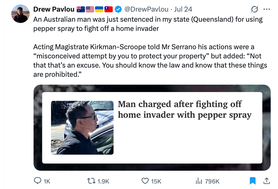This article is behind a paywall but you can read more about it at this link. If you don’t want to end up in prison, just let the home invaders kill you. That’s basically what the court is saying. Because we no longer have a right to protect ourselves in the once lucky country.