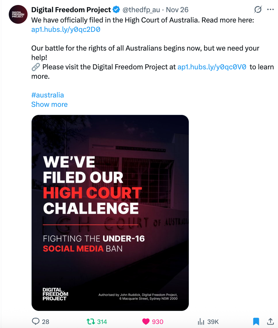 This is one of at least 3 lawsuits against the Under 16 ban that I am aware of. Can we trust our judicial system to provide a fair and balanced trial against the government? Time will tell.