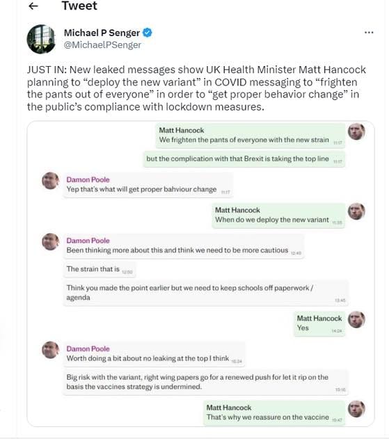 In this thread, Matt Hancock is speaking with his special advisor, Damon Poole. They are discussing when was the best time to ‘deploy’ the new variant in order to “frighten the pants of [sic] everyone.