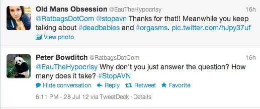 Quick explanation for those who have always thought the word 'bigotry' was synonymous with 'racism', in actuality, a bigot is anyone who is intolerant of those who hold differing opinions. So you could say that everyone who is a member of Stop the AVN - by definition - is a bigot. As are the media, the government and most mainstream medical organisations.