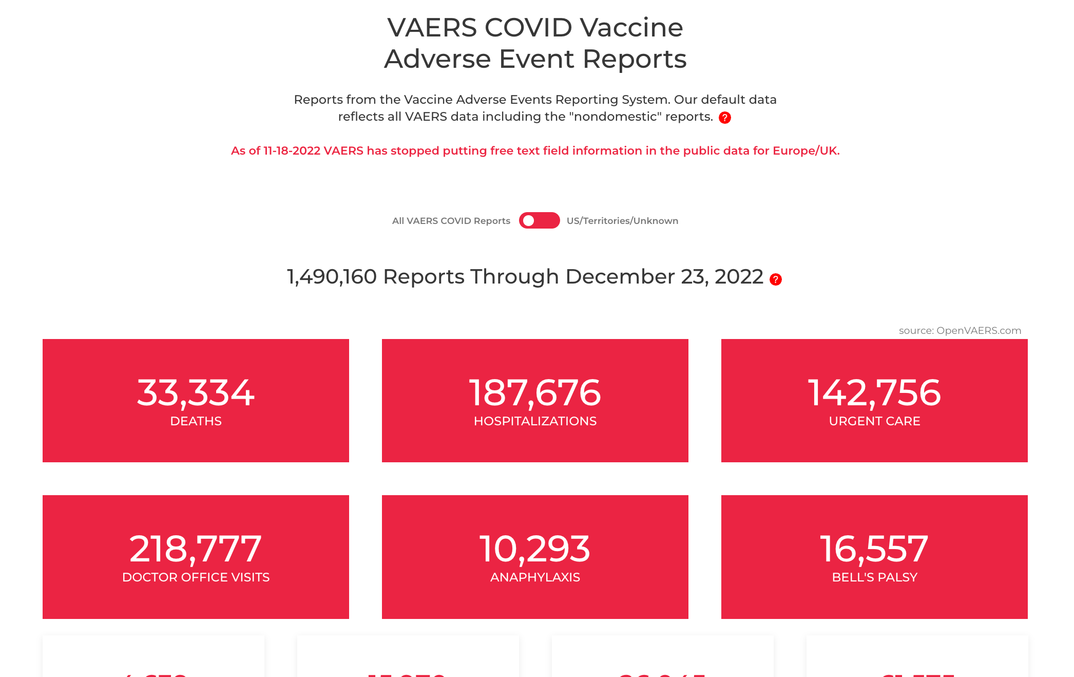 With nearly 1.5 million reactions reported to VAERS (see below) - and the minimum underreporting factor of 31 meaning this is actually closer to 46 million reactions! And 33,000+ deaths - conservative underreporting factor of 4 equaling at least 133,336 unnecessary preventable deaths, safety is obviously not a concern.