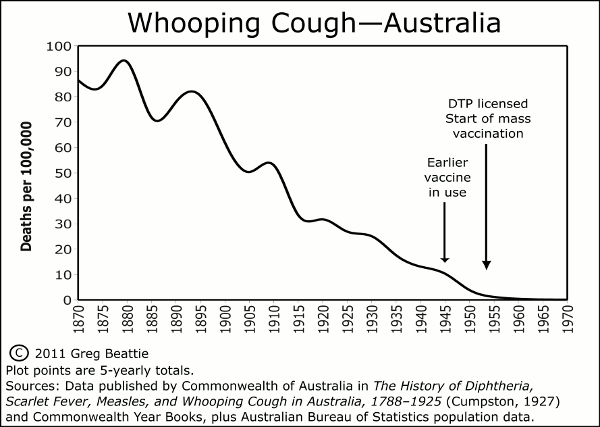 According to government statistics, Whooping Cough killed over 90 people out of 100,000 in the late 1800s. Unlike measles, a vaccine against Whooping Cough was introduced much earlier - in the mid-1940s in Australia. It was not widely used however until the introduction of the Australian Childhood Immunisation Schedule in 1953 and even then, until the late 1990s, the vaccination rate was never far above 70%. By that time, as you can clearly see, deaths from Whooping Cough had declined by over 90% and use of the vaccine did nothing to cause that decline to accelerate.