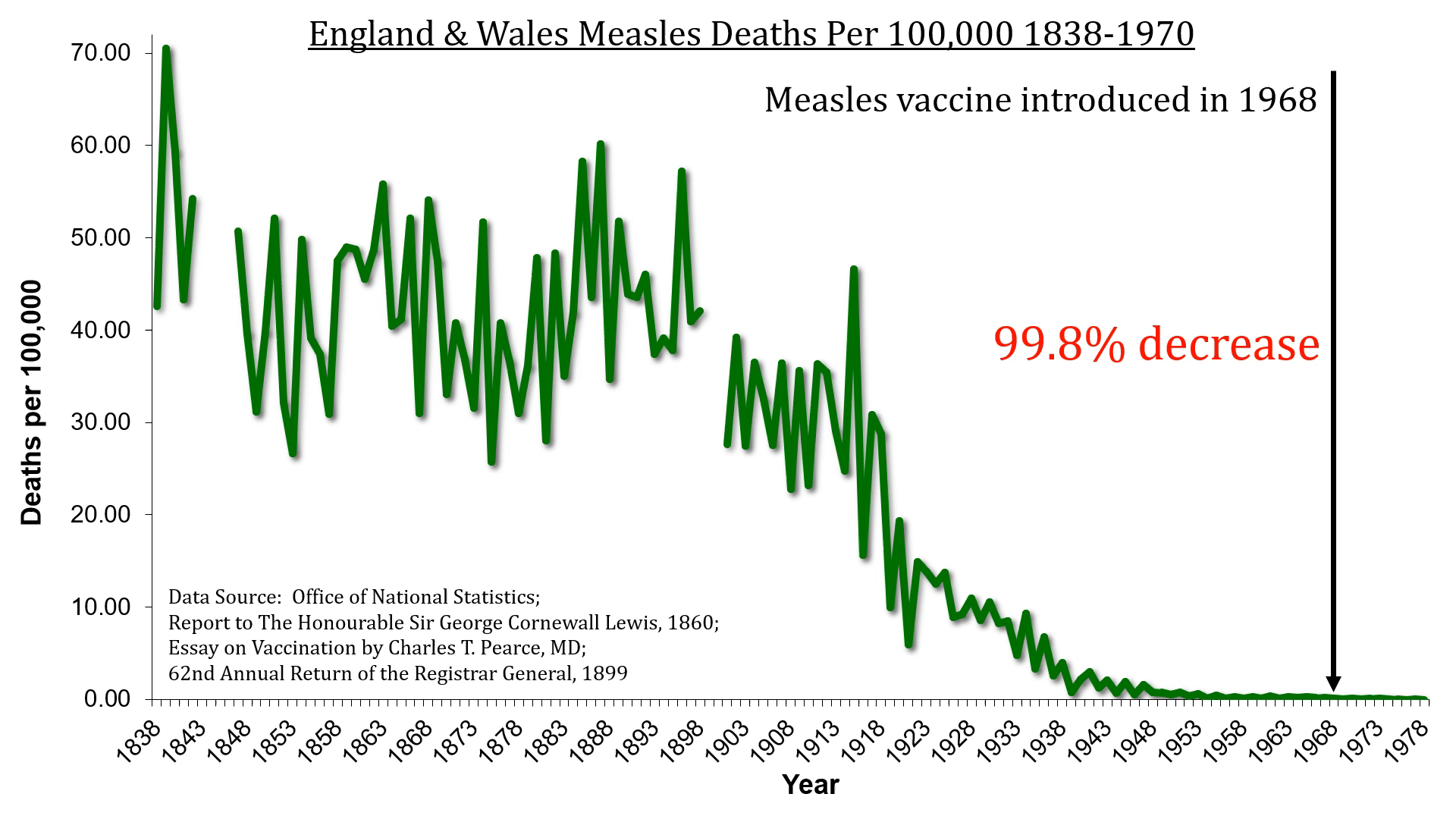 That wasn’t always the case, however. As you can see from the table below, in the late 1800s, measles killed as many as 180 people out of 100,000 who contracted it. But something changed between 1870 and 1970 when the measles vaccine was first used here. Deaths declined by over 99%! We’ve been told that measles deaths disappeared because of a vaccine that didn’t even exist until it was already gone.