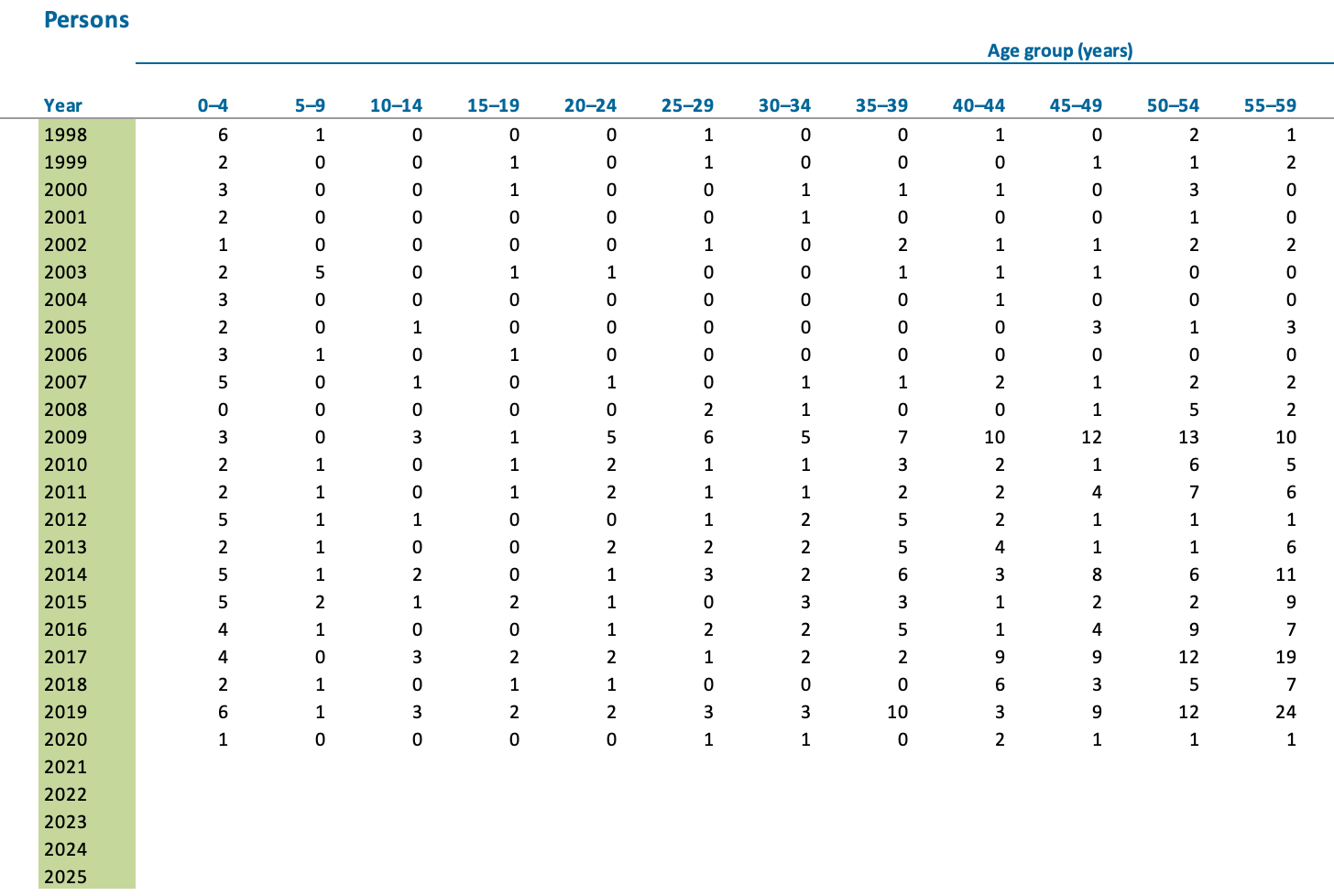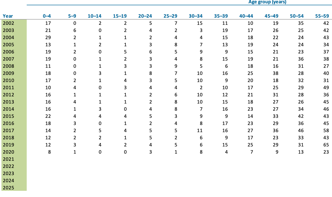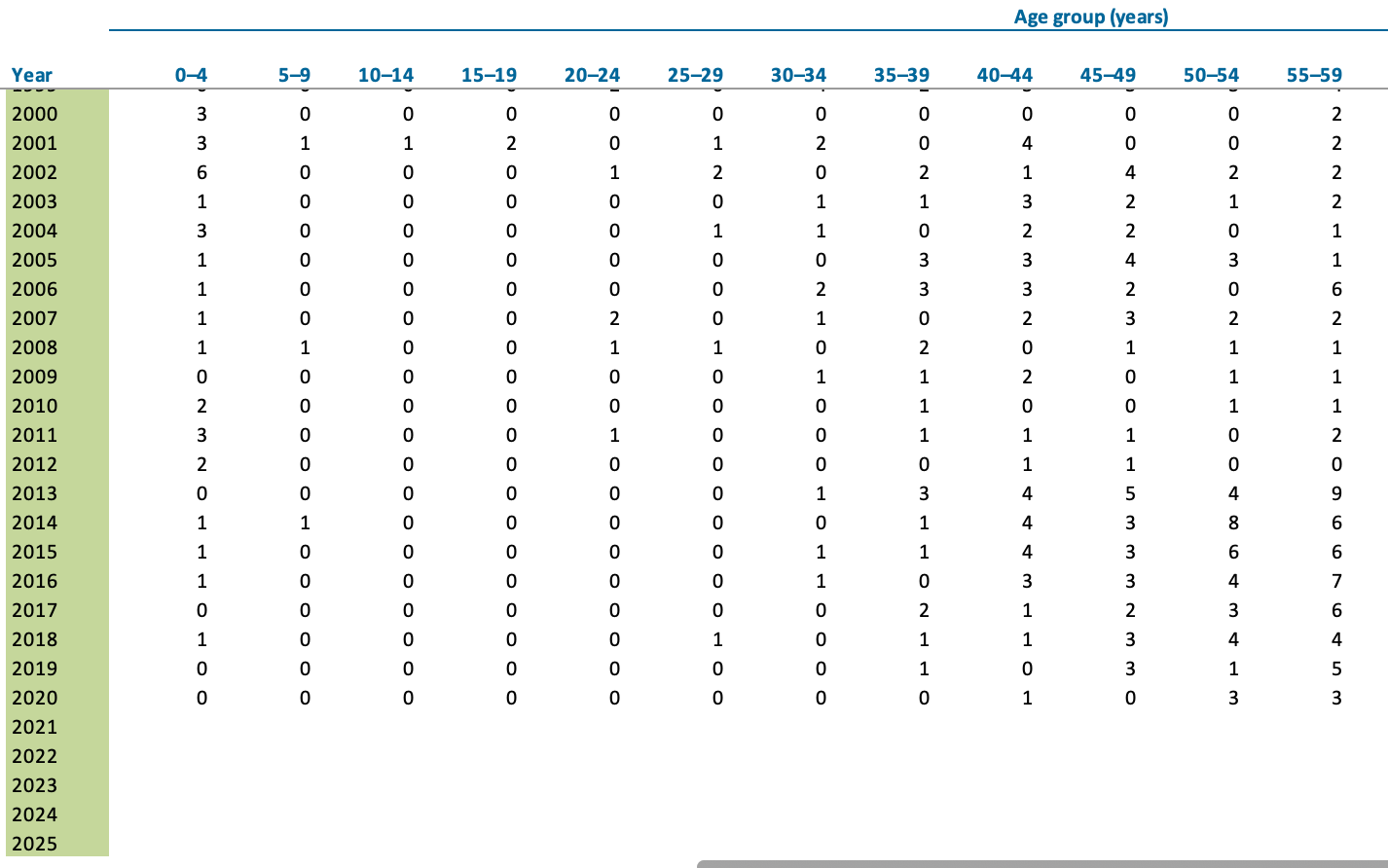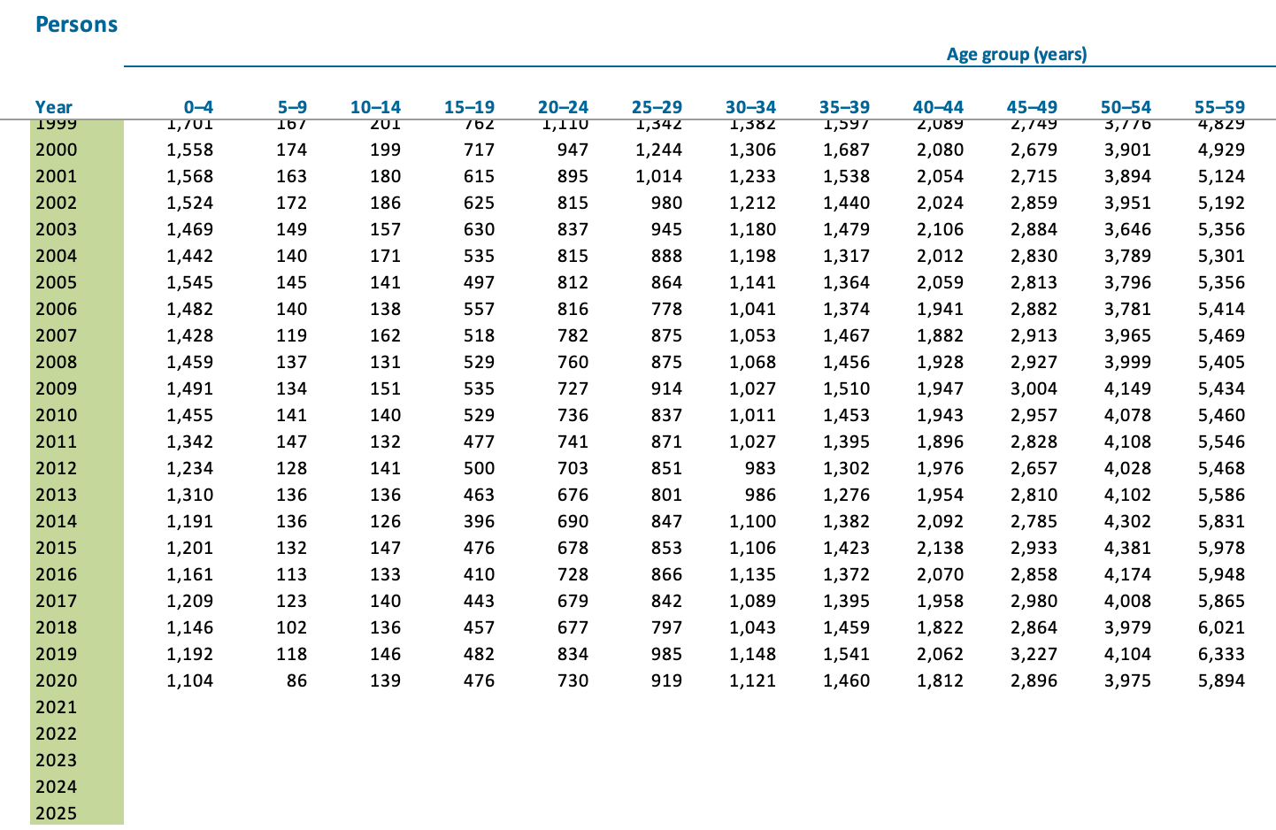 Looking first at deaths from all causes, we can see that in 2020 (the year of the ‘pandemic’ prior to the release of any experimental injectable), for Australia as a whole, we had 1,104 deaths in the 0-4 group, 86 deaths in the 5-9 age group and 139 aged 10-14. So totalling these up, the deaths from any cause in that cohort is 1,329 deaths.