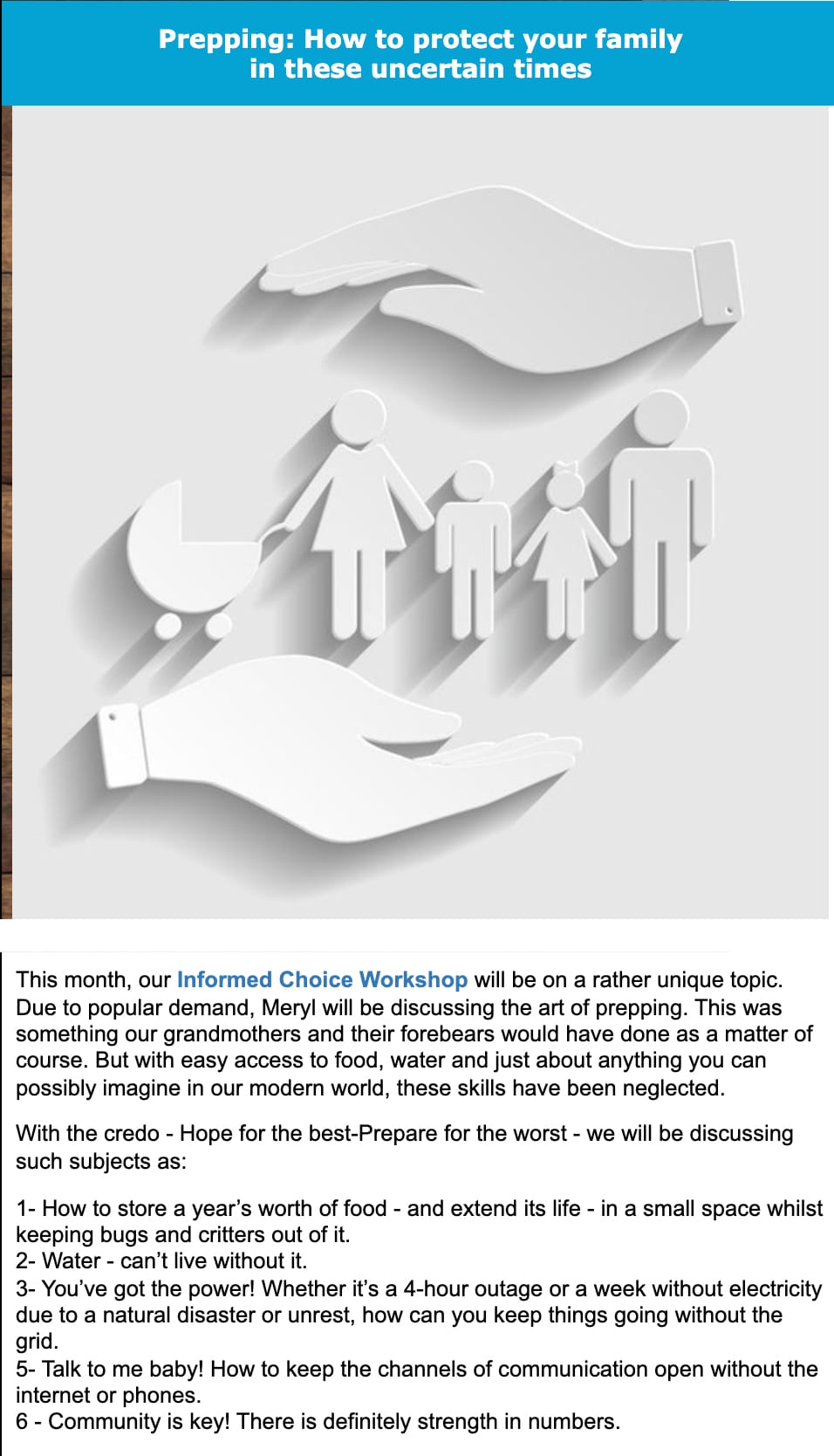 Join Meryl in this month’s Informed Choice workshop to learn the basics of prepping and to gain confidence that you will be able to not just survive but thrive when the SHTF.