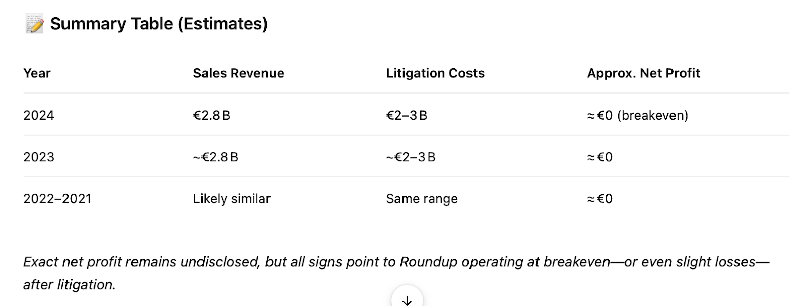 The following table is an estimate of Bayer’s profit from RoundUp since 2021:
