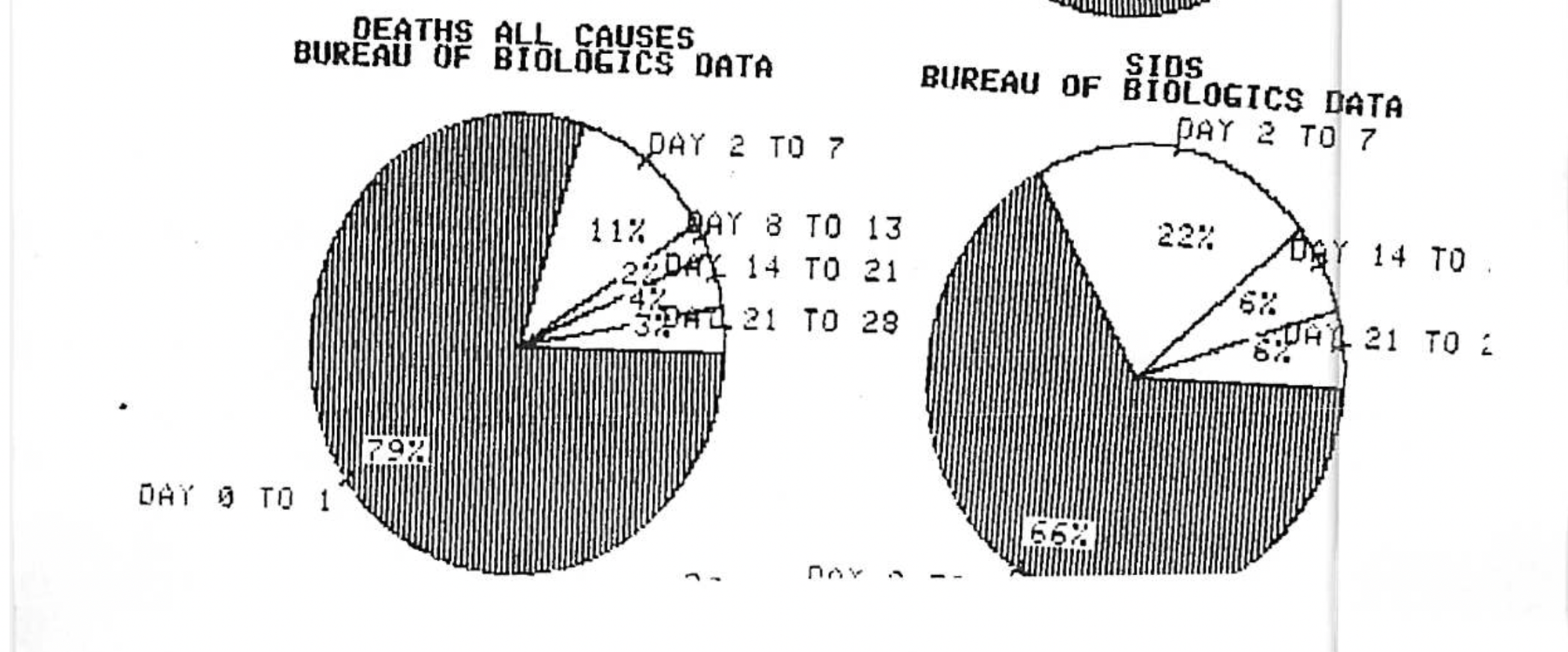In the following graph that was sent to me as a FAX (yes, it is THAT old) by Dr Mark Geier in the US, you see that in this particular study by the Bureau of Biologics, which was never published because the results were absolutely damning regarding death from vaccination, the vast majority of children who died apparently ‘without cause’ did so within 24 hours (Day 1) of receiving a vaccine.
