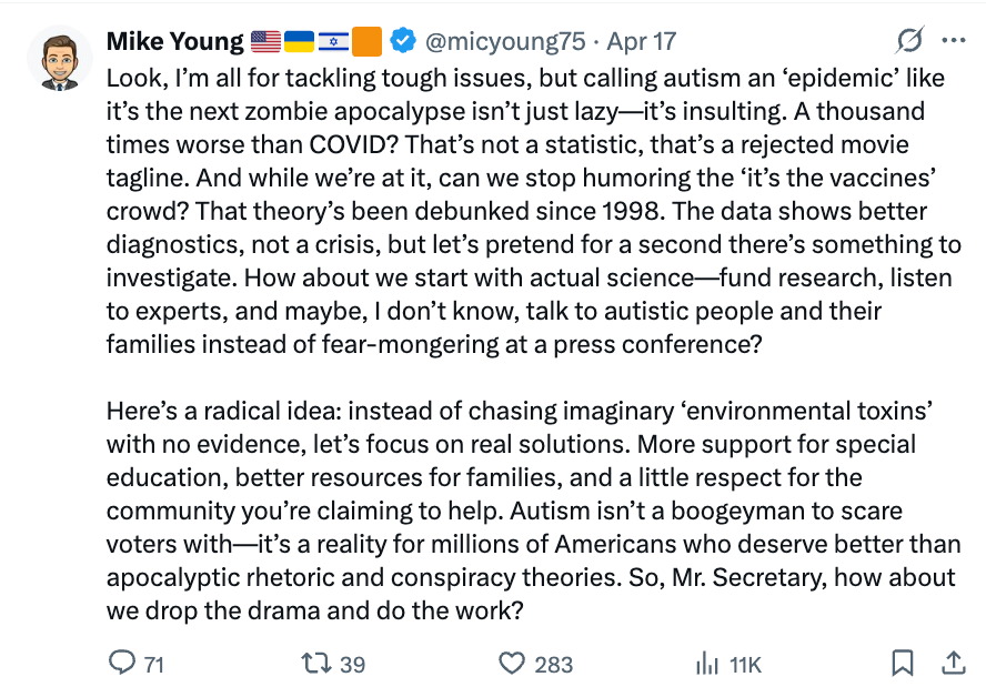 So when Secretary Kennedy came out and said that the HHS was going to be announcing several studies to examine environmental and toxicological causes of the Autism epidemice and they expected to have the answers by September this year, you would have expected that people would be cheering and urging him to keep going.
