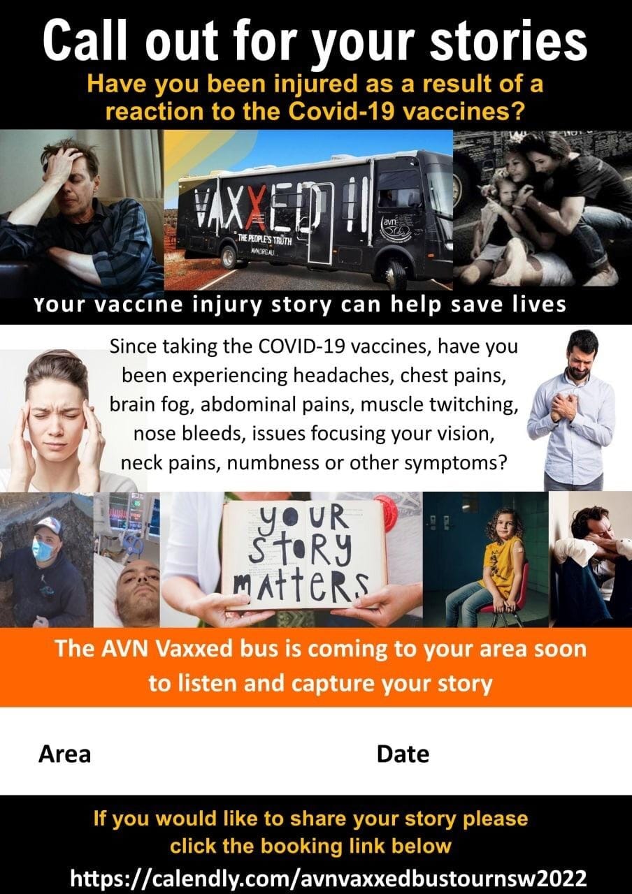 Lastly, I am leaving on Monday for the start of this VaxXed Bus tour of NSW. Bookings are essential as only those who book will receive notification of the exact location. We would love to see you and speak with you/share your stories. So please click this link to book if you are anywhere along our route and whether you are or are not, your sharing of this information would be such a huge help! Your stories matter! In fact, they can save a life. So please come along and tell others too.