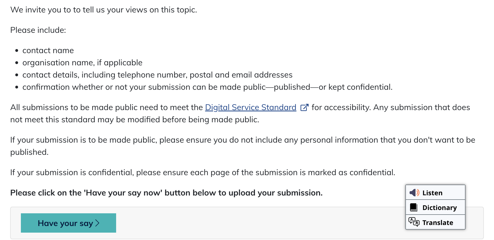 Click the image below which describes how to have your say and you will be taken to the page. As I said, your submission does not have to be more than 1 paragraph long simply stating what your objections are to this policy. But it is VITAL that you do make a submission and as all of your friends, family, business associates and anyone else you know to do the same. Be sure to follow the instructions to leave your full name, an organisation name if you are writing on behalf of an organisation, and your contact details and let them know if you want your submission to be made public or kept confidential.