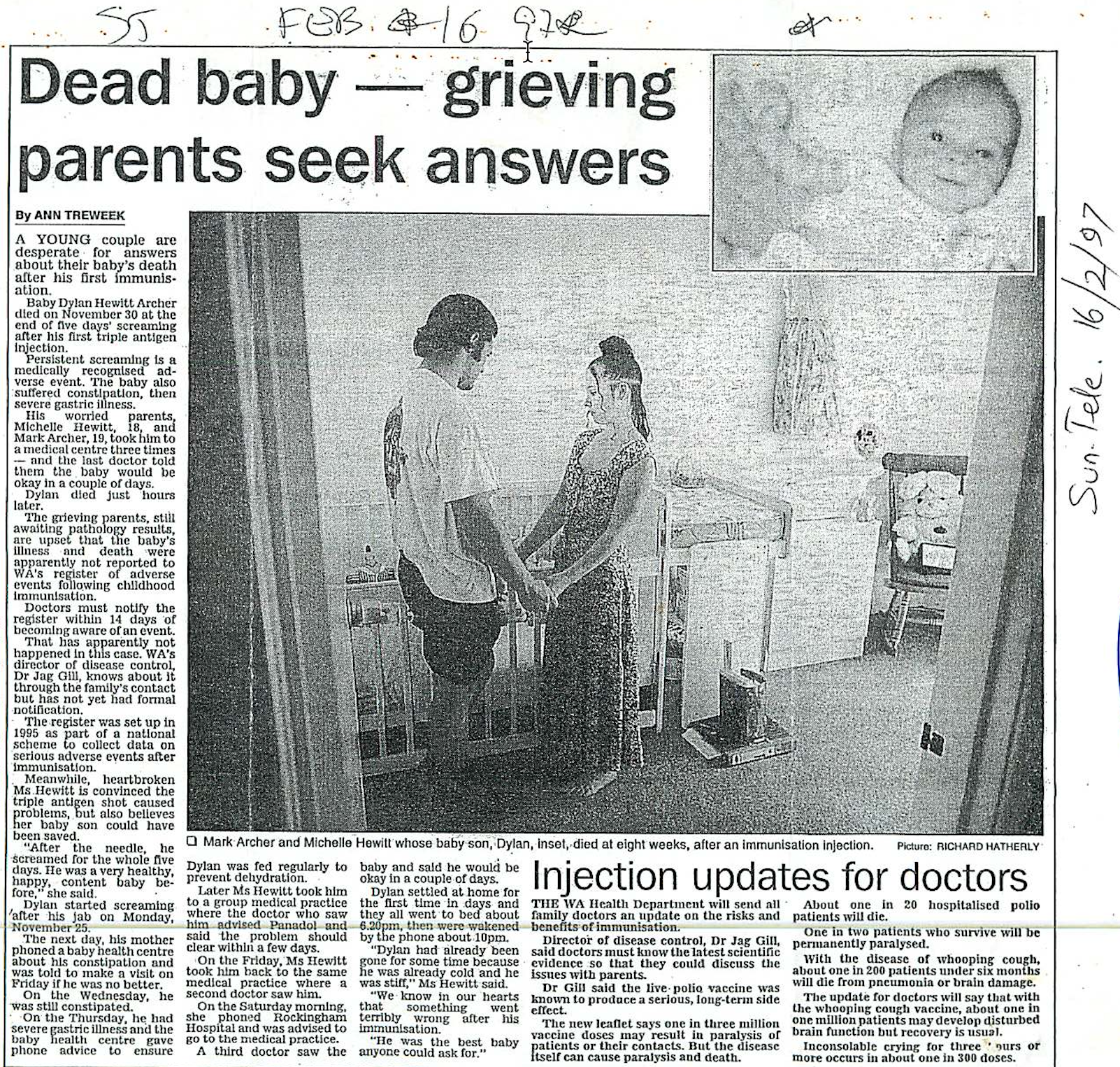 A young couple in WA lost their first baby, Dylan, five days after his first vaccinations. He screamed almost non-stop for that entire time and was seen by multiple doctors who did absolutely nothing for him but simply made excuses for his condition.
