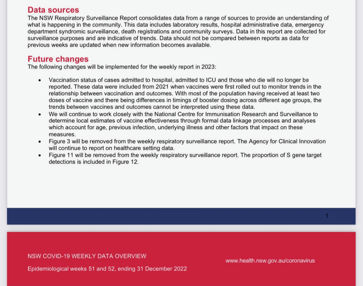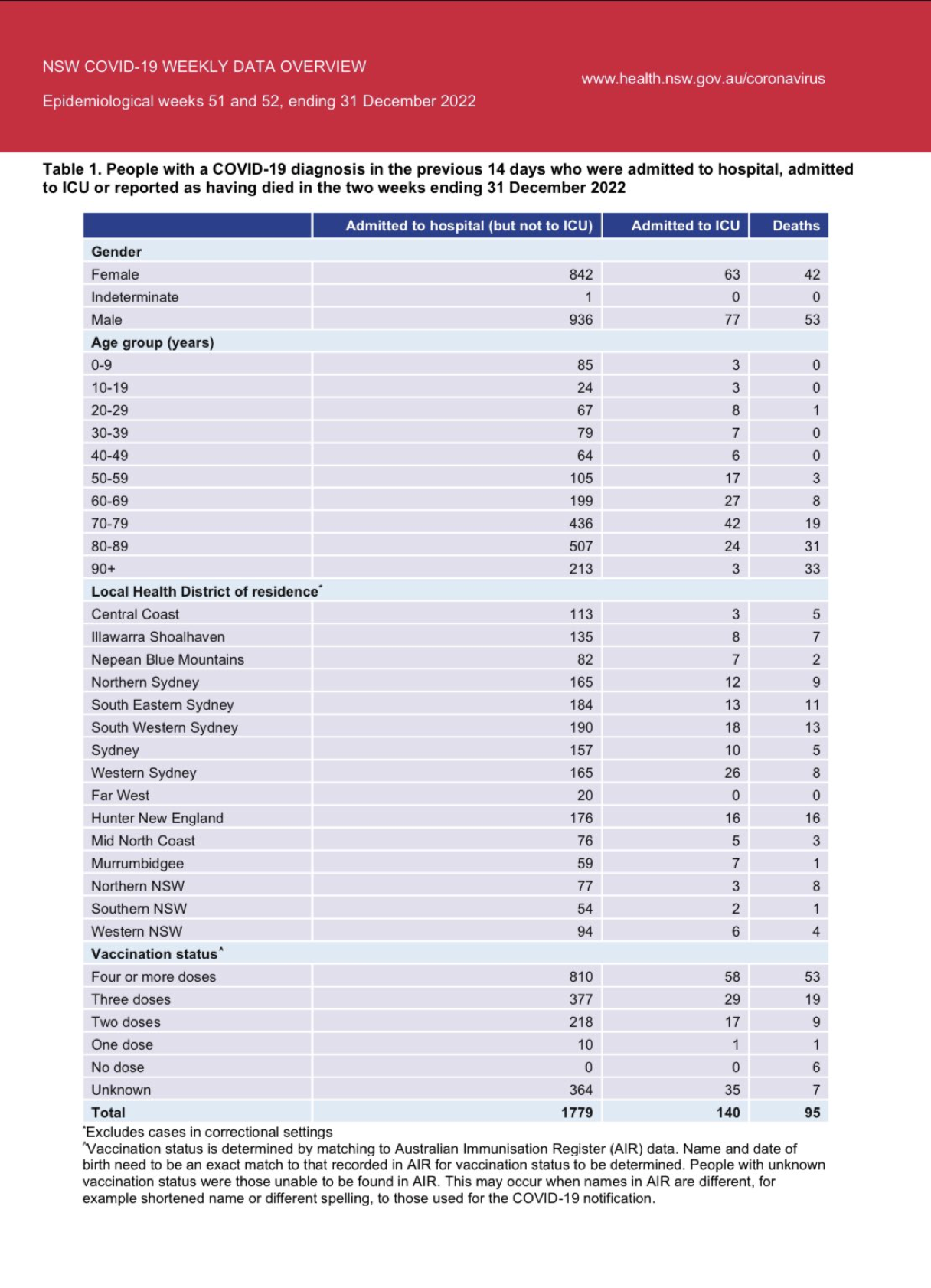New South Wales is the only State in Australia - to the best of my knowledge - that has been publishing weekly stats regarding hospital and ICU admissions for COVID and deaths from COVID, specifying the number of doses of the ‘countermeasure’ (the non-vaccine genetic modification injection) each person has had.
