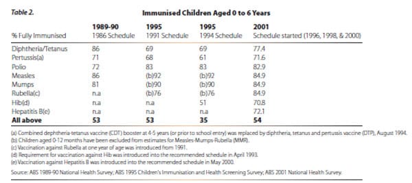 Conversely, had children of the same age been represented in both tables, say children immunized at 2 years old, by 1989-1990, the percentage of children fully vaccinated for pertussis would have been negligible (approaching 0%) since the vaccination schedule had changed toward providing pertussis vaccine to children up through age six. Therefore, the comparative manner in which Meryl Dorey presented the data actually took into account the differences in the vaccination schedule and reported the relationship of the change in percentage as accurately as permitted by the table data.