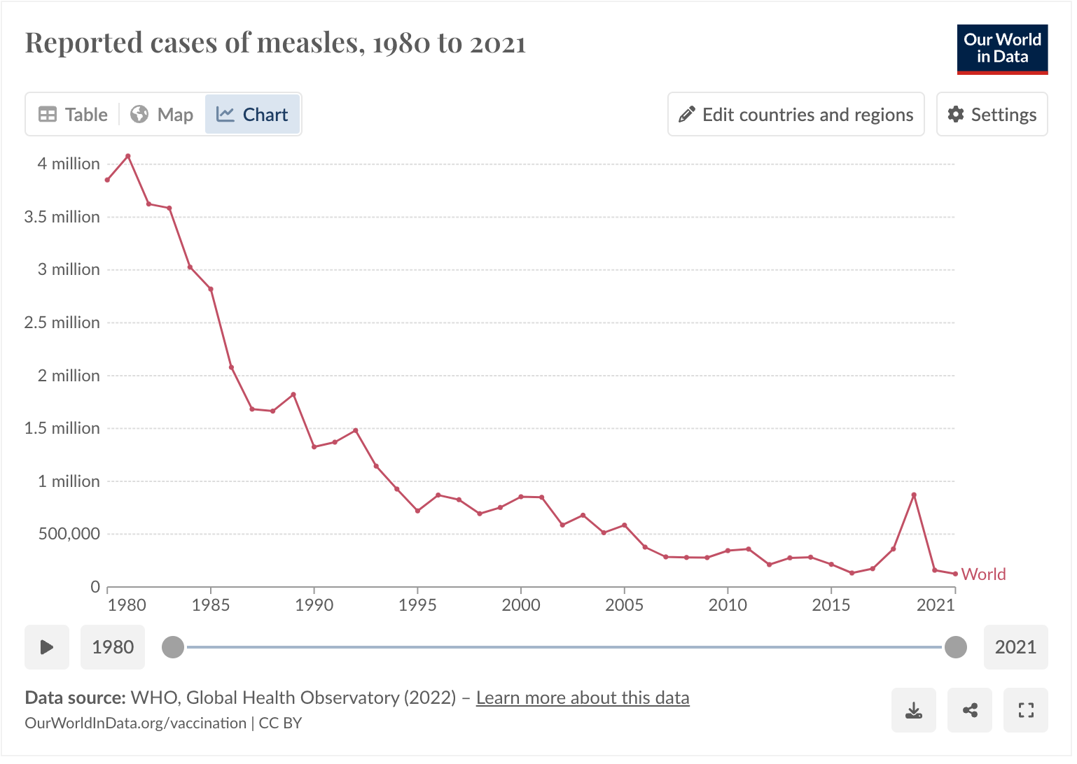 For a bit of perspective, here is a chart from Our World in Data that goes up to 2022 and shows the reported ‘cases’ of measles worldwide. Interesting, no?