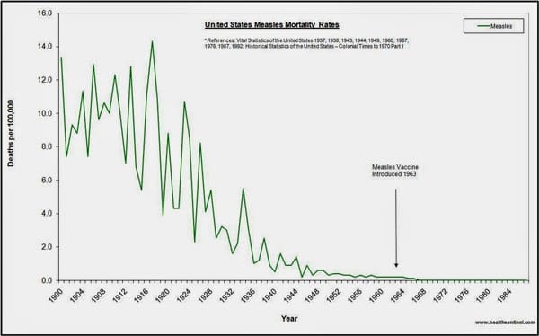 One last thing - promise! The 99.99% reduction actually happened before the vaccine - at least in developed countries. Below is the graph for mortality from measles in Australia. The vaccine was introduced in 1970 and was part of the schedule from 1971. What do you observe regarding deaths before that time?