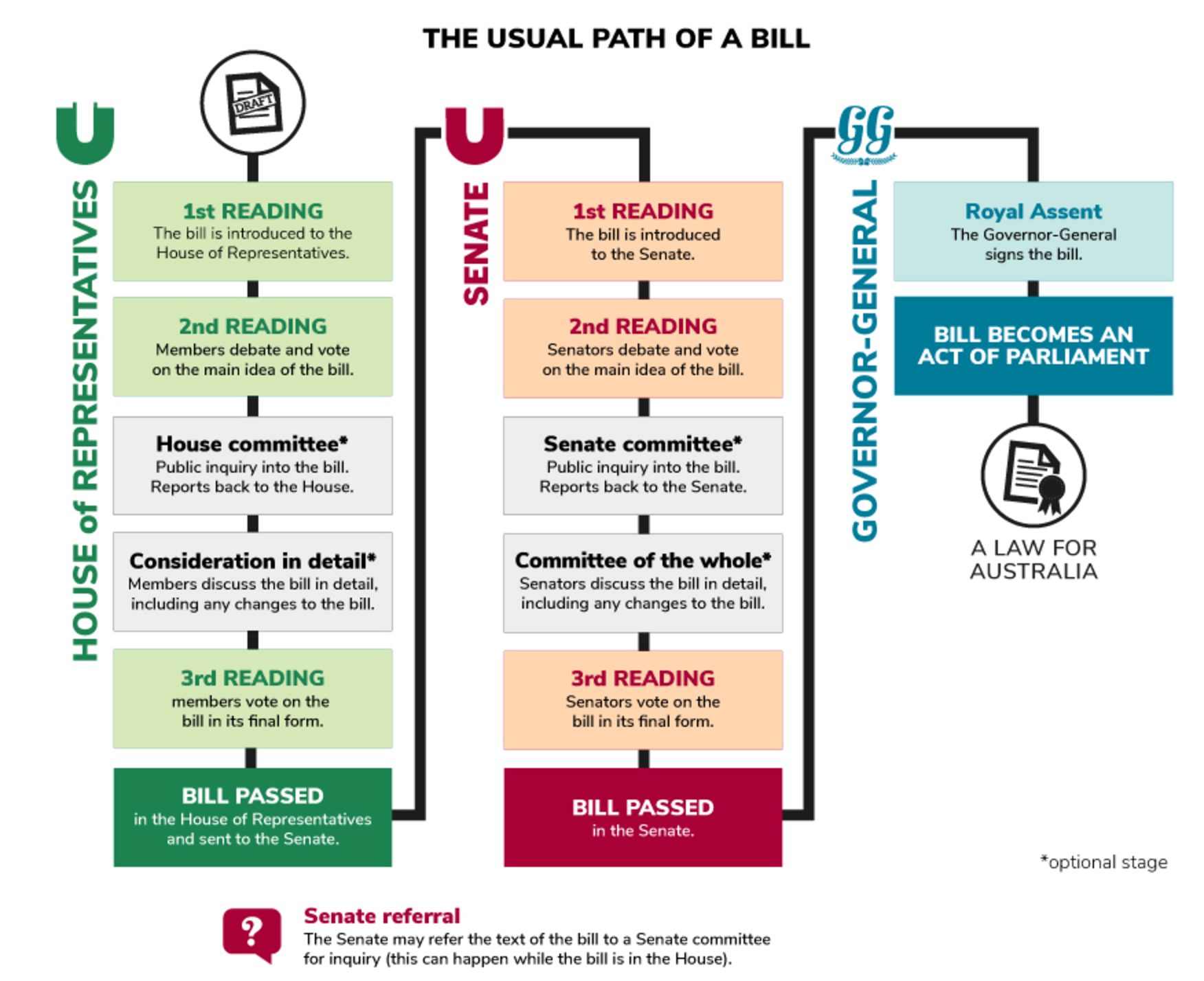 This graphic illustrates the usual path of a bill through the Australian Parliament to become Australian law