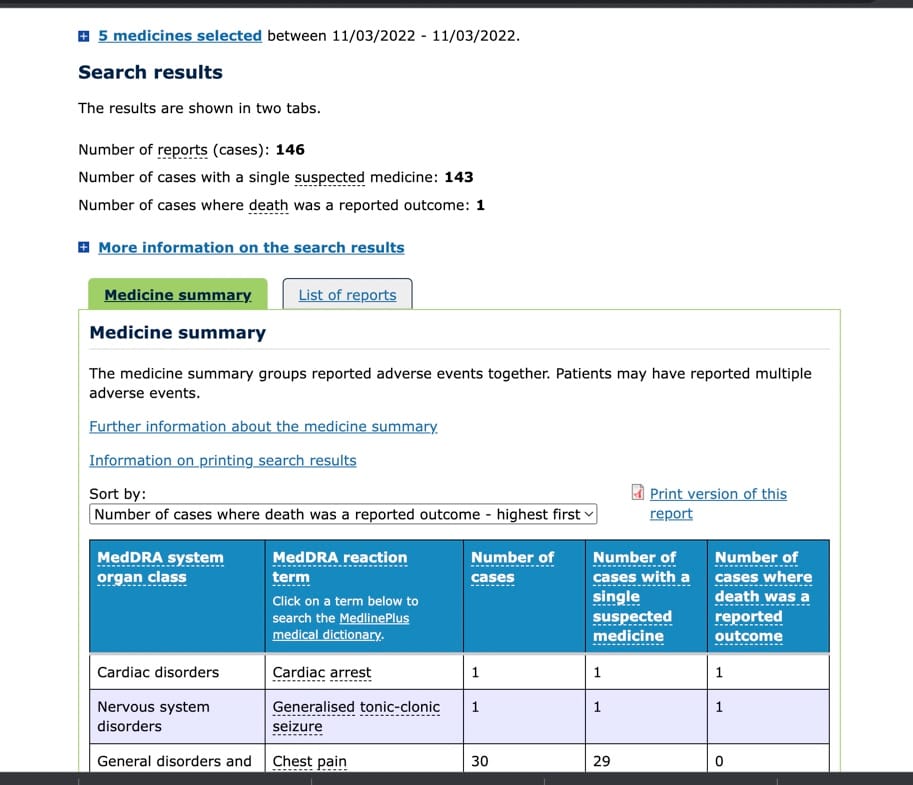 This passive reporting system is thought to have an underreporting factor (URF) of at least 31 times. So in the table below which represents all COVID jab reactions reported on the 11th of March this year, there were 146 reactions including 1 death (the one noted above).