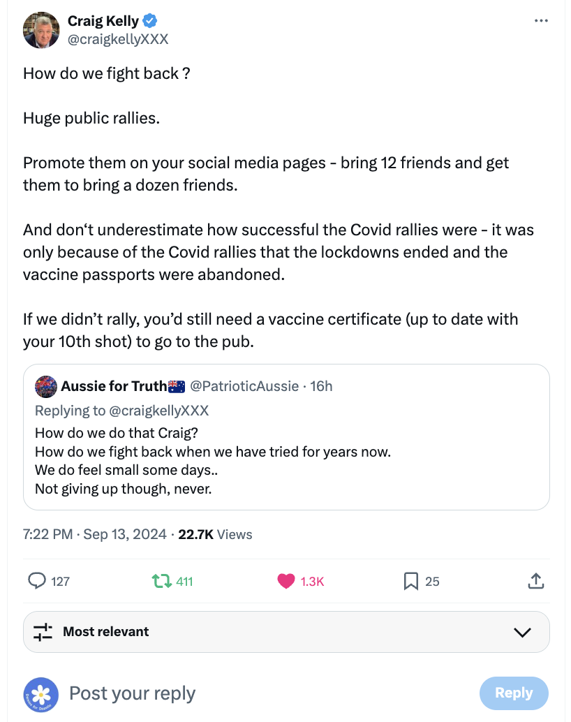 Craig Kelly, former MP, has called for rallies nationwide on the 28th of September. This is all the information I have right now but he says that the only reason why lockdowns were lifted was because of the HUGE rally in Canberra in February 2022.