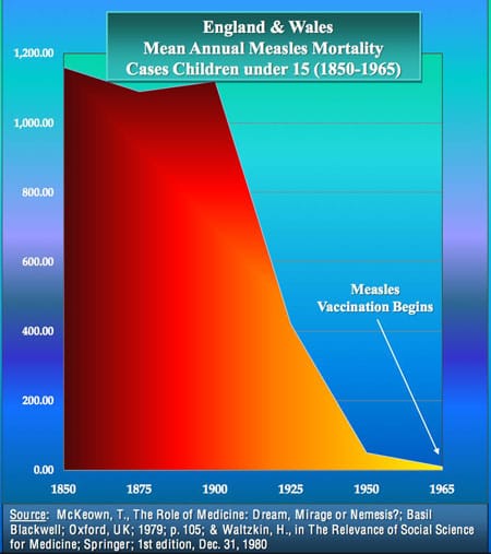 What follows is a graph of the mortality (deaths) from measles in England and Wales for the the 115 years before the introduction of the measles vaccine. As you can see, the decline in deaths parallels the decline in incidence - without the use of vaccines.